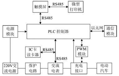 交流充電樁的硬件系統(tǒng)主要由觸摸屏、IC卡讀卡器、PLC控制器、微型打印機、交流電表、充電接口、通信模塊、電源模塊、PWM模塊等組成,如下圖所示: